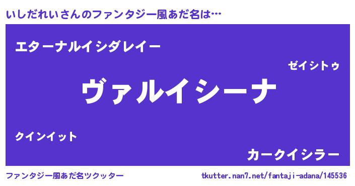 | 男性向けラノベタイトル風あだ名 | 『魔弾の王といしだれい』 |