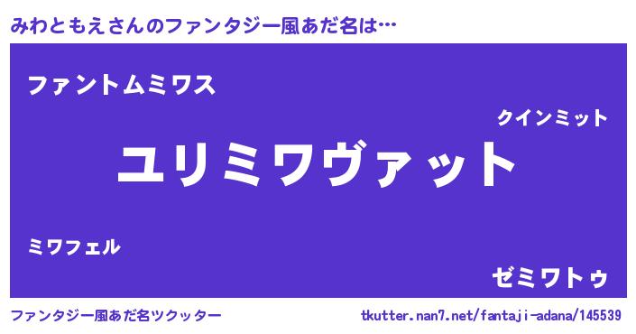 | 男性向けラノベタイトル風あだ名 | 『みわともえ~年齢イコール彼女いない歴の魔法使い~』 |