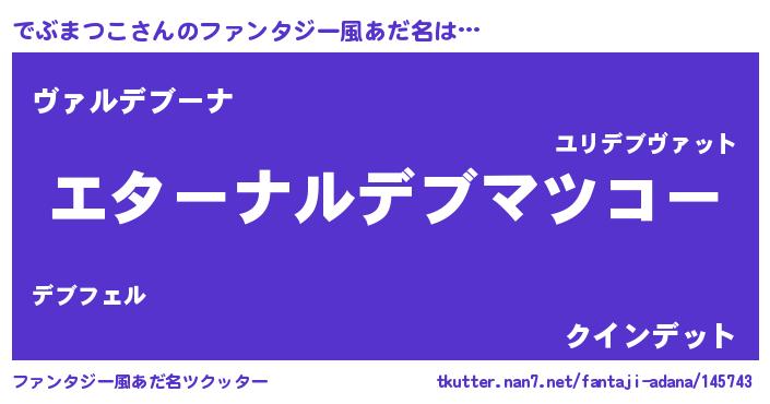 | 男性向けラノベタイトル風あだ名 | 『うちの娘の為ならば、俺はもしかしたらでぶまつこも倒せるかもしれない。』 |