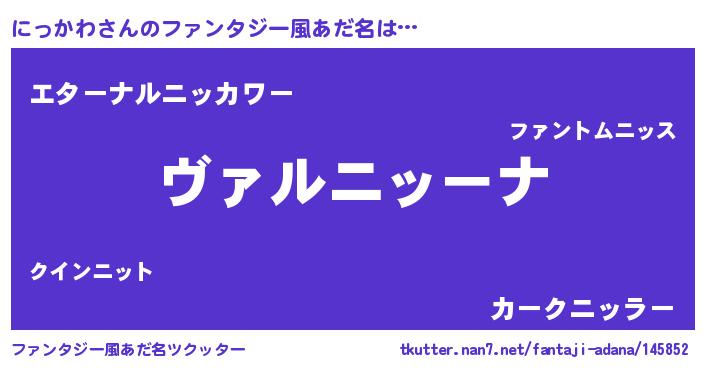| 男性向けラノベタイトル風あだ名 | 『魔弾の王とにっかわ』 |