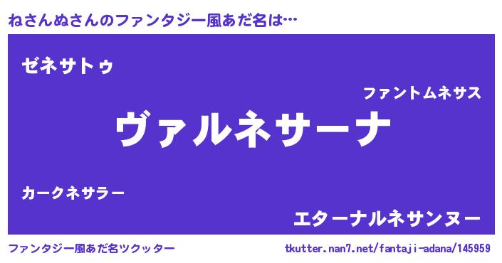 | 男性向けラノベタイトル風あだ名 | 『魔弾の王とねさんぬ』 |