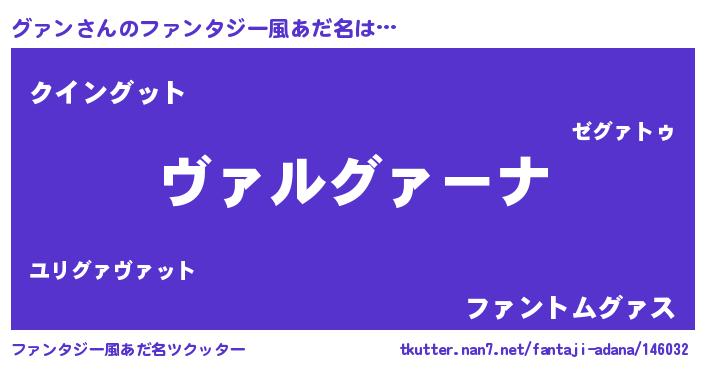 | 男性向けラノベタイトル風あだ名 | 『魔弾の王とグァン』 |