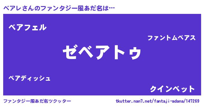 | 男性向けラノベタイトル風あだ名 | 『Re:べアレから始める異世界生活』 |