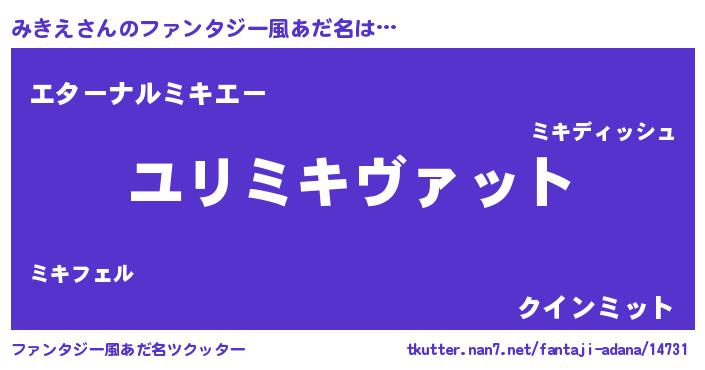 | 男性向けラノベタイトル風あだ名 | 『みきえ~年齢イコール彼女いない歴の魔法使い~』 |