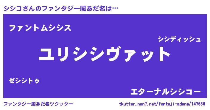| 男性向けラノベタイトル風あだ名 | 『シシコ~年齢イコール彼女いない歴の魔法使い~』 |