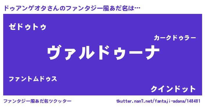 | 女子向けラノベタイトル風あだ名 | 『ドゥアンゲオタが死なない童話 林檎のドゥアンゲオタの診療簿』 |