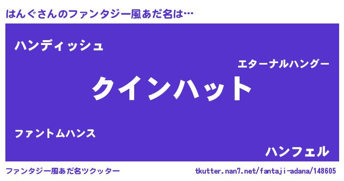 | 女子向けラノベタイトル風あだ名 | 『死神はんぐの再婚』『はんぐの契約王妃』 |