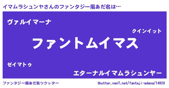 | 男性向けラノベタイトル風あだ名 | 『イマムラシュンヤの嫁は女の子じゃないと思った?』 |