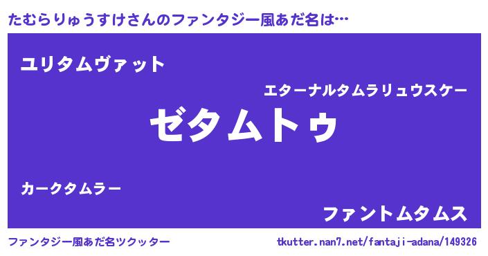 | 男性向けラノベタイトル風あだ名 | 『Re:たむらりゅうすけから始める異世界生活』 |