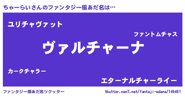 | 男性向けラノベタイトル風あだ名 | 『魔弾の王とちゃーらい』 |