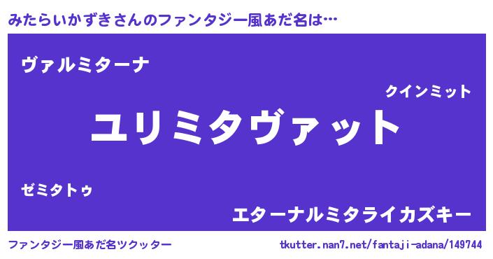 | 男性向けラノベタイトル風あだ名 | 『みたらいかずき~年齢イコール彼女いない歴の魔法使い~』 |