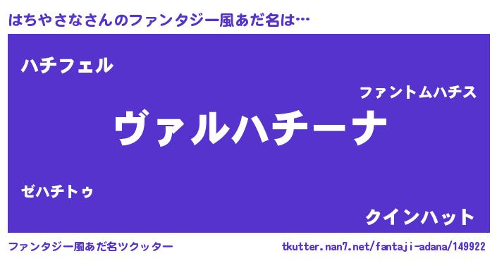| 男性向けラノベタイトル風あだ名 | 『魔弾の王とはちやさな』 |