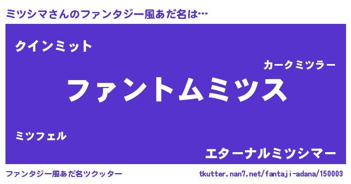 | 女子向けラノベタイトル風あだ名 | 『ミツシマの卵を拾いまして』 |
