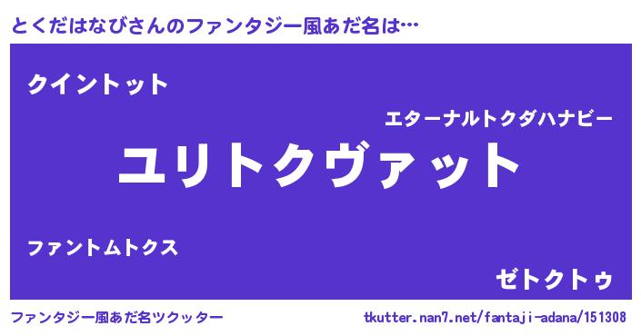 | 男性向けラノベタイトル風あだ名 | 『とくだはなび~年齢イコール彼女いない歴の魔法使い~』 |