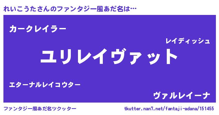 | 男性向けラノベタイトル風あだ名 | 『れいこうた~年齢イコール彼女いない歴の魔法使い~』 |