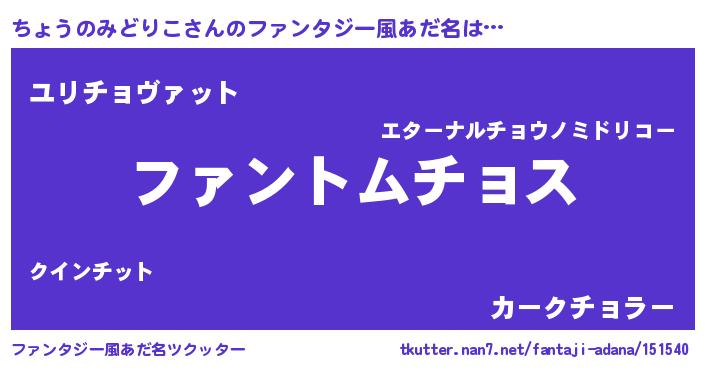| 男性向けラノベタイトル風あだ名 | 『ちょうのみどりこに滅ぼされるだけの簡単なお仕事です』 |