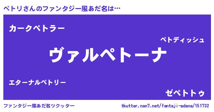 | ヒーロー風カッコイイあだ名 | 『仮面ペトダー』『最強戦士ペトリ』 |