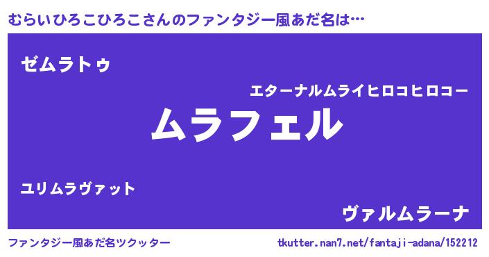 | 男性向けラノベタイトル風あだ名 | 『ムライヒロコヒロコアートオンライン』 |