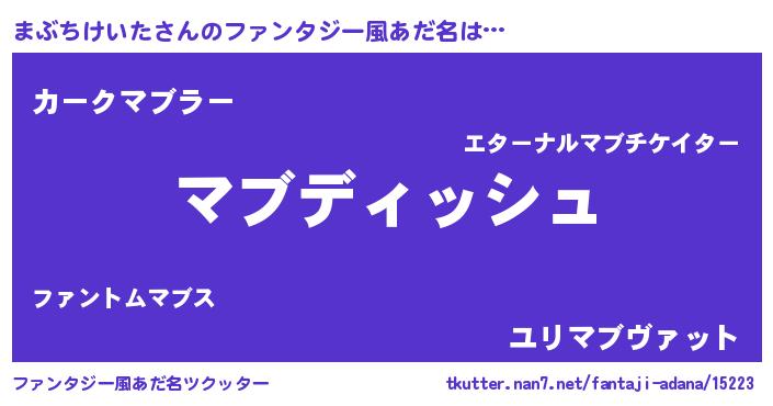 | 女子向けラノベタイトル風あだ名 | 『異世界で失敗しない100のまぶちけいた』 |