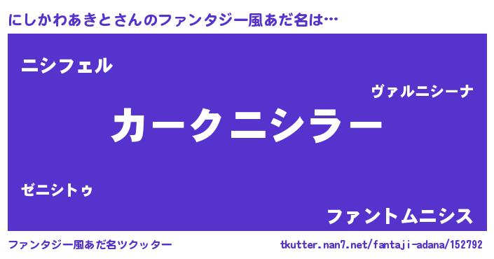 | 男性向けラノベタイトル風あだ名 | 『緋弾のニシカワアキト』 |