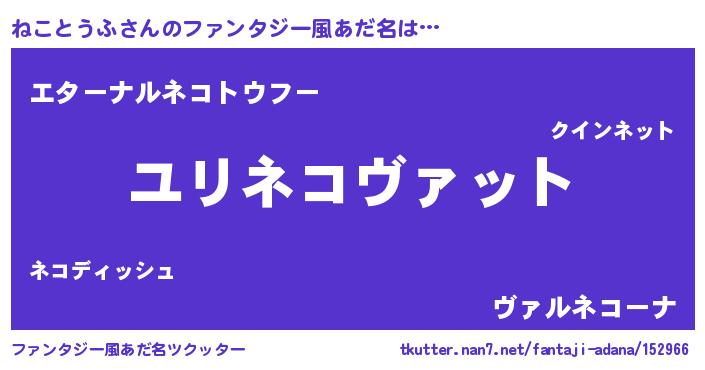 | 男性向けラノベタイトル風あだ名 | 『ねことうふ~年齢イコール彼女いない歴の魔法使い~』 |