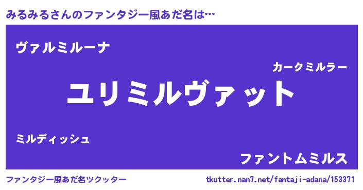 | 女子向けラノベタイトル風あだ名 | 『みるみるの玉の輿計画!』 |