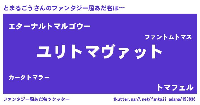 | 男性向けラノベタイトル風あだ名 | 『とまるごう~年齢イコール彼女いない歴の魔法使い~』 |