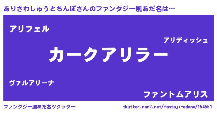 | 男性向けラノベタイトル風あだ名 | 『冴えないありさわしゅうとちんぽの育てかた』 |
