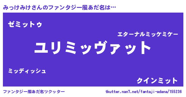 | 男性向けラノベタイトル風あだ名 | 『みっけみけ~年齢イコール彼女いない歴の魔法使い~』 |