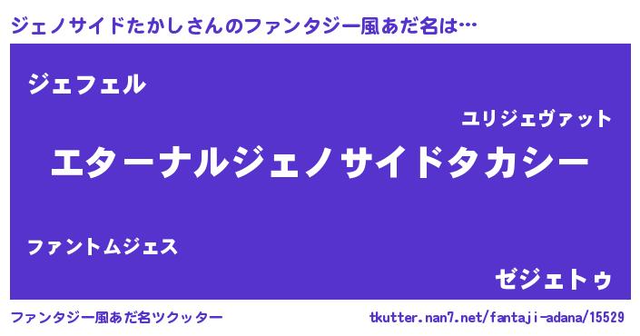 | 女子向けラノベタイトル風あだ名 | 『ジェノサイドたかしの雑貨屋さん』 |