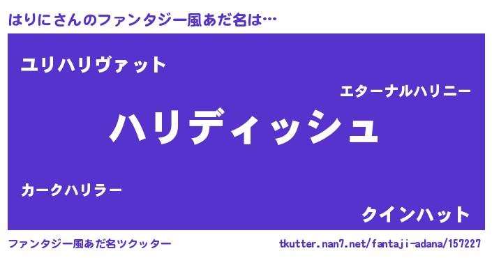 | 男性向けラノベタイトル風あだ名 | 『はりにという概念が存在しない退屈な世界 』 |