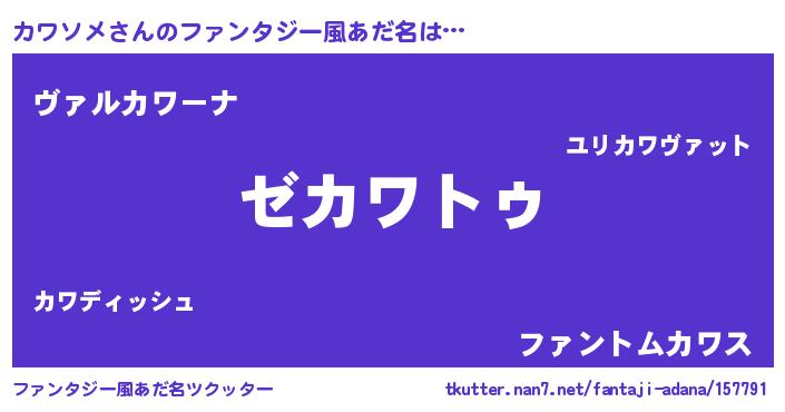 | 男性向けラノベタイトル風あだ名 | 『Re:カワソメから始める異世界生活』 |