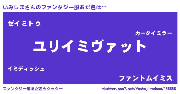 | 男性向けラノベタイトル風あだ名 | 『いみしま~年齢イコール彼女いない歴の魔法使い~』 |