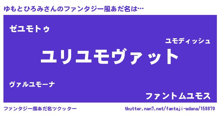 | 男性向けラノベタイトル風あだ名 | 『ゆもとひろみ~年齢イコール彼女いない歴の魔法使い~』 |