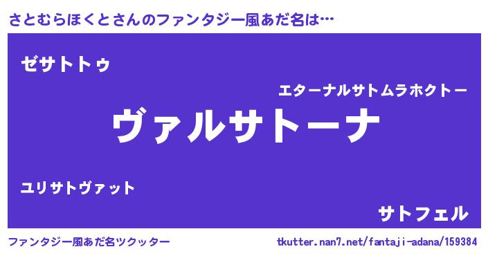 | 男性向けラノベタイトル風あだ名 | 『魔弾の王とさとむらほくと』 |