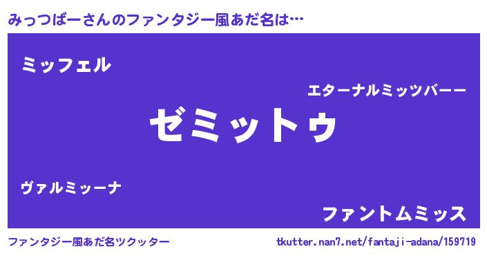 | 男性向けラノベタイトル風あだ名 | 『Re:みっつばーから始める異世界生活』 |