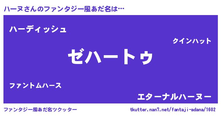 | 女子向けラノベタイトル風あだ名 | 『ハーヌなんてお断りですっ。』 |