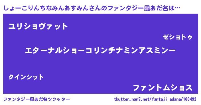 | 欧米人風あだ名 | 『アンジェラ・しょーこりんちなみんあすみん』 |