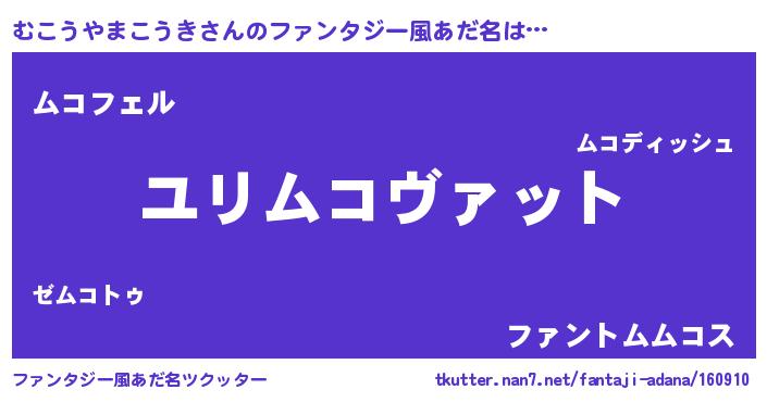 | 男性向けラノベタイトル風あだ名 | 『むこうやまこうき~年齢イコール彼女いない歴の魔法使い~』 |