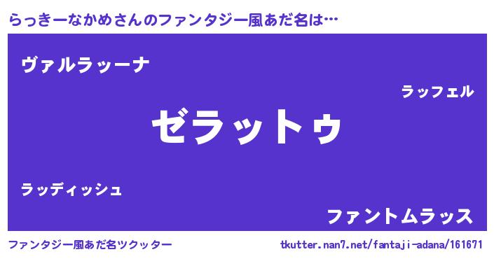 | 女子向けラノベタイトル風あだ名 | 『らっきーなかめなんてお断りですっ。』 |