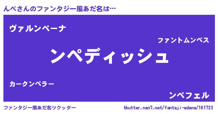 | 男性向けラノベタイトル風あだ名 | 『んぺという概念が存在しない退屈な世界 』 |