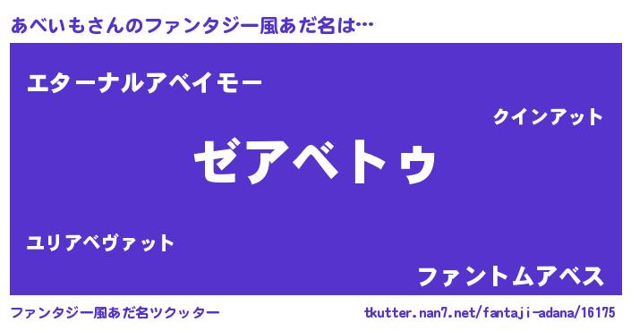 | 男性向けラノベタイトル風あだ名 | 『Re:あべいもから始める異世界生活』 |