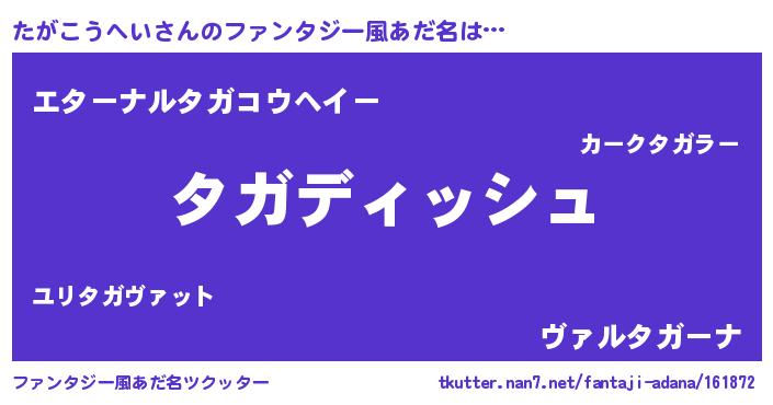 | 男性向けラノベタイトル風あだ名 | 『たがこうへいという概念が存在しない退屈な世界 』 |