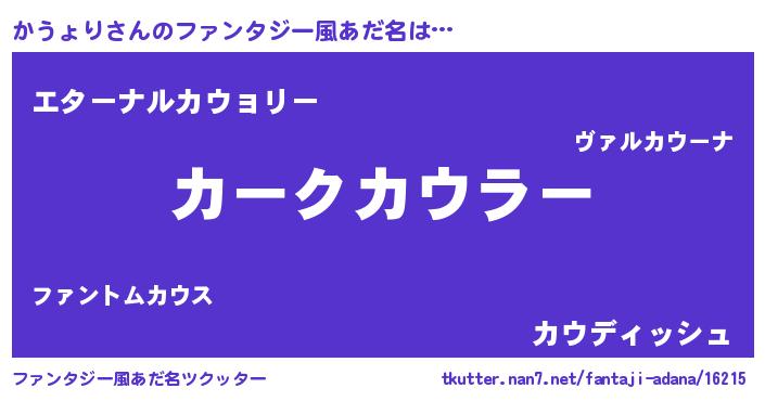 | 男性向けラノベタイトル風あだ名 | 『緋弾のカウョリ』『魔弾の王とかうょり』 |