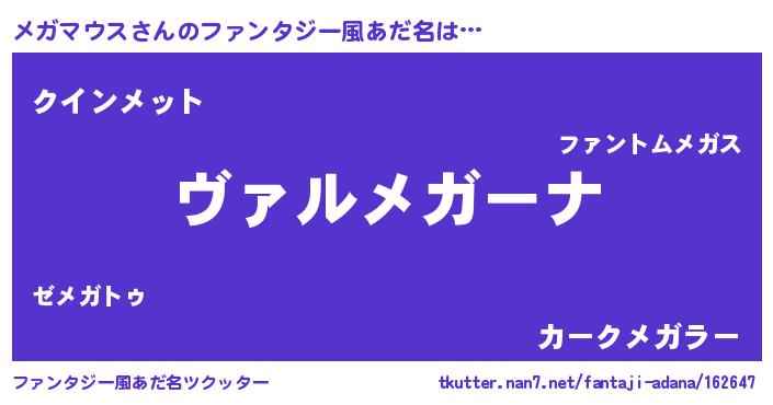 | 男性向けラノベタイトル風あだ名 | 『魔弾の王とメガマウス』 |