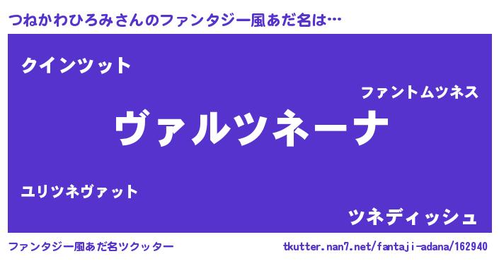 | 男性向けラノベタイトル風あだ名 | 『魔弾の王とつねかわひろみ』 |