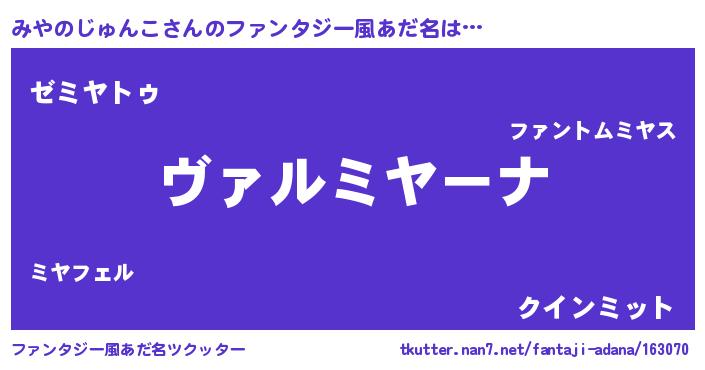 | 男性向けラノベタイトル風あだ名 | 『魔弾の王とみやのじゅんこ』 |