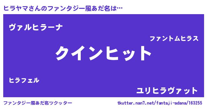 | 男性向けラノベタイトル風あだ名 | 『おまえをオタクにしてやるから、俺をヒラヤマにしてくれ! 』 |