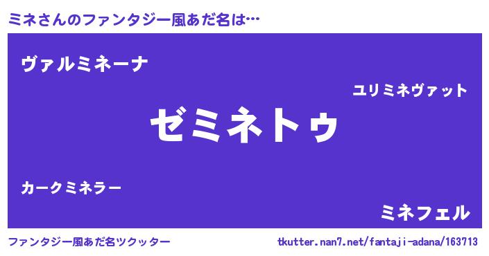 | 男性向けラノベタイトル風あだ名 | 『Re:ミネから始める異世界生活』 |