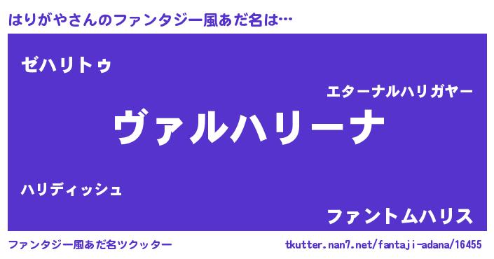 | 女子向けラノベタイトル風あだ名 | 『乙女ゲームの破滅フラグしかない悪役はりがやに転生してしまった…』 |